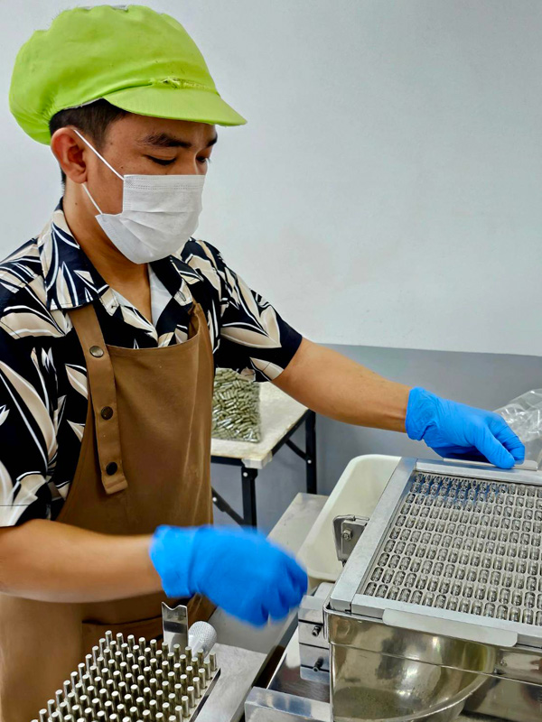 Nicht nur der traditionelle Jiaogulan Anbau, sondern auch die weitere Verarbeitung spielt eine wichtige Rolle bei der Qualitätssicherung unserer Jiaogulan Produkte. Unsere Jiaogulan Kapseln werden direkt vor Ort in Nordthailand hergestellt. Die Kapseln bestehen aus 100 Prozent reiner Cellulose und sind dementsprechend frei von sämtlichen tierischen Inhaltsstoffen. Die verwendete Hydroxypropylmethylcelluloseist in der Herstellung deutlich komplizierter, hält aber das einzigartige Aroma des Jiaogulan dank einer guten Luftbarriere auf natürliche Weise aufrecht. Um die wohlbekannten Jiaogulan Kapseln herzustellen, wird zunächst der getrocknete Jiaogulan zu Pulver verarbeitet. Hierbei sehen wir es als selbstverständlich an, dass nur das reine Blatt, nicht aber die Stiele, die das Pulver strecken und dadurch billiger machen, verarbeitet wird. Das hochwertige Pulver wird dann gepresst und mit einem Zellulose-Film umwickelt. So entsteht in feinster Handarbeit jede Kapsel einzeln. Die Wahrung dieser hohen Qualität ist uns ganz besonders wichtig