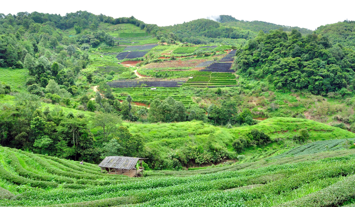 Unser Jiaogulan Tee stammt aus den nördlichen Regionen in Thailand. Dort wird er liebevoll ohne Zusatz von chemischem Dünger oder anderen Pestiziden gezogen. Unsere dort traditionell angebauten Sorten sind ein besonderes Geschmackserlebnis und werden regelmäßig von unabhängigen Laboren auf etwaige Verunreinigungen oder Rückstände überprüft. Bei unserem Besuch auf der Jiaogulan Plantage ließen wir uns selbstverständlich eine Führung durch den Plantagenbesitzer nicht entgehen. Er erklärte uns erneut detailliert den Anbau der rankenden Pflanzen und die Vergrößerung der Plantage über all die Jahre. Ein gut durchlüfteter Boden mit feuchter Erde ist ideal für das sogenannte „Kraut der Unsterblichen“. Aus diesem Grund eignen sich vor allem sandige Lehmböden für den traditionellen Jiaogulan Anbau, da diese das Wasser gut halten können. Ein Reichtum an Phosphor, Stickstoff und Humus im Boden führt zu einem noch besseren Wachstum. Außerdem bevorzugen die Gewächse eine schattige Lage, die auf unseren Plantagen durch luftdurchlässige Beschattungen auf Bambuspfählen gewährleistet wird.