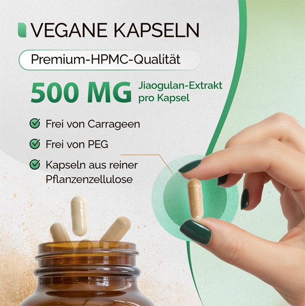 Verzehrempfehlung: täglich 1 Kapsel (500 mg Jiaogulan Extrakt) mit 200 ml Wasser einnehmen.